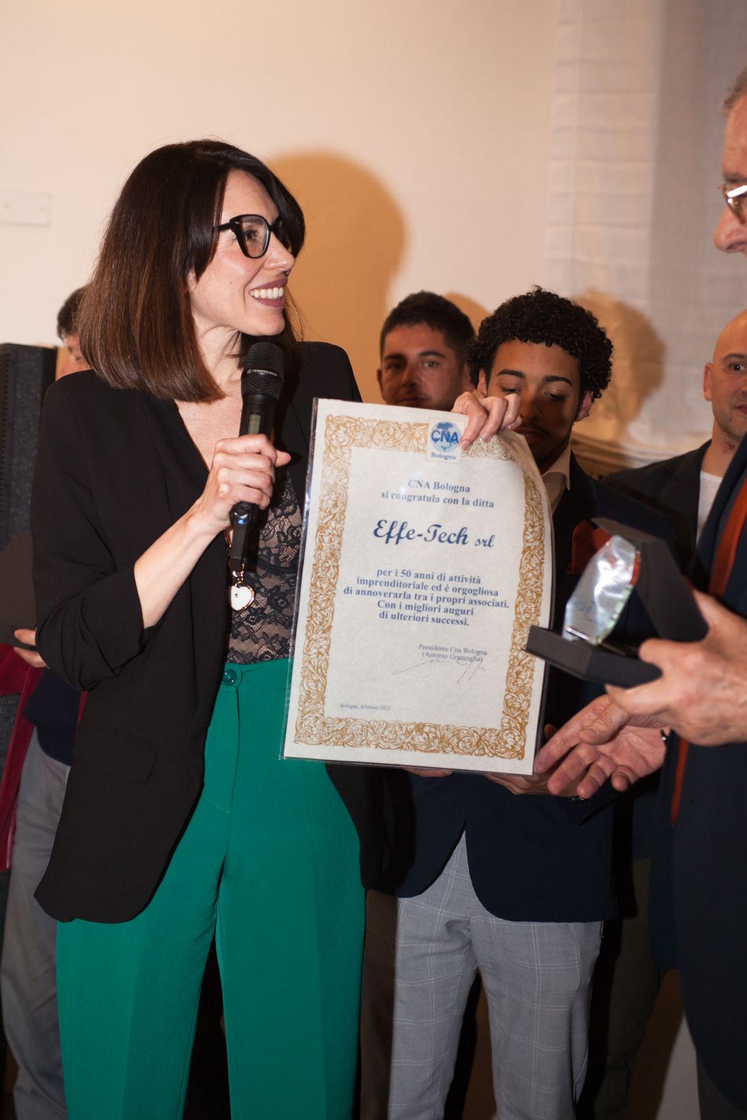 Il tema dell’evoluzione del mercato è stato affrontato anche da Chiara Fariselli, socia e attuale amministratore delegato della Effe-Tech, che ha sottolineato come l’azienda sia cambiata, negli ultimi dieci anni: “Abbiamo affrontato momenti di grande incertezza a livello direzionale, con i relativi scogli che si possono incontrare in un passaggio generazionale. Oggi mi ritengo fortunata di poter condividere questa avventura con mio fratello, perché la famiglia è la cosa più importante e ci ha tenuti uniti nei momenti più impegnativi. Sono convita che le aziende di successo siano quelle dove si presta attenzione a valorizzare le persone che le compongono. L’armonia, la collaborazione, la motivazione, creano una squadra coesa, dove ognuno svolge il proprio compito, fondamentale per ottenere obiettivi comuni. Serietà, professionalità, cura e soddisfazione del cliente oltre alla crescita professionale e motivazionale del personale che lavora con noi: sono questi i valori fondanti della nostra attività”. Il suo discorso si è concluso con la premiazione di tutti i collaboratori: Paola, Debora, Fabio, Simone, Davide, Daniele, Dennis, Alberto, Marco, Alpha, Alessandro, Manuel, ai quali è stata consegnata una targa ricordo dell’anniversario. “É anche grazie a voi se siamo qui stasera a festeggiare i nostri primi 50 anni – ha precisato - siete il valore aggiunto di Effe-Tech, siamo orgogliosi della nostra squadra”. Una targa speciale è stata consegnata da Chiara anche al padre, Angelo Fariselli “per l’esempio e la guida che sei stato, sei tuttora e sarai sempre”.